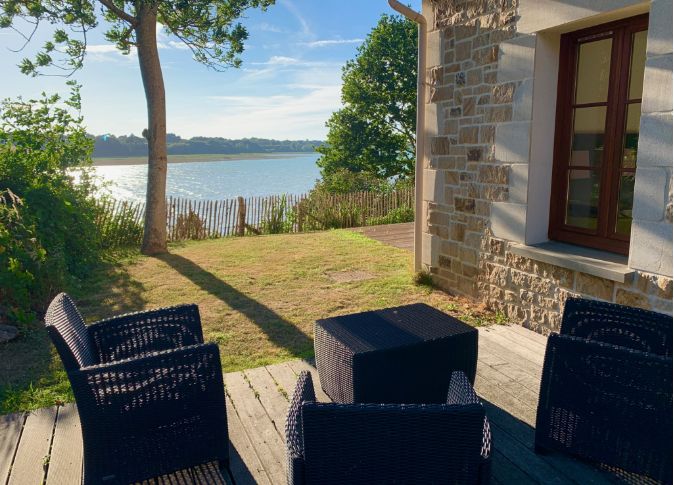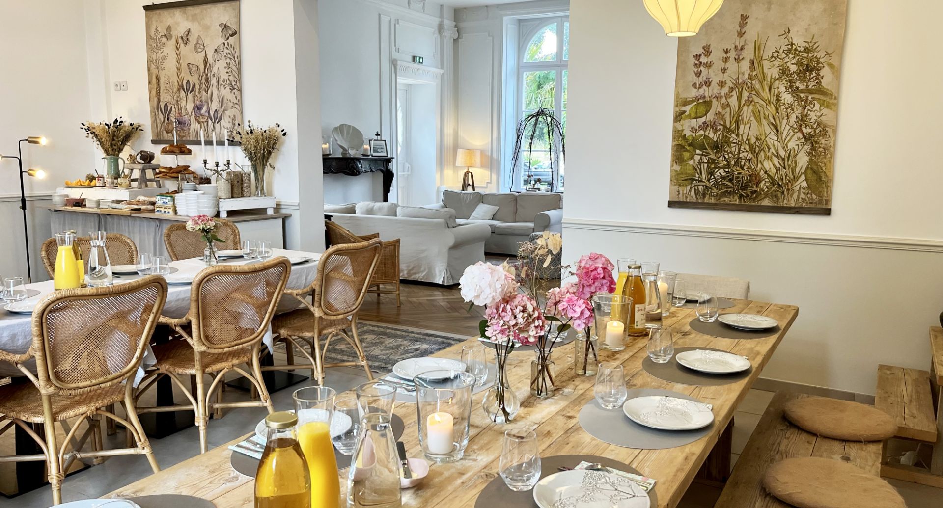 Un petit déjeuner bio et local est servi dans les salons du château, face à la mer.