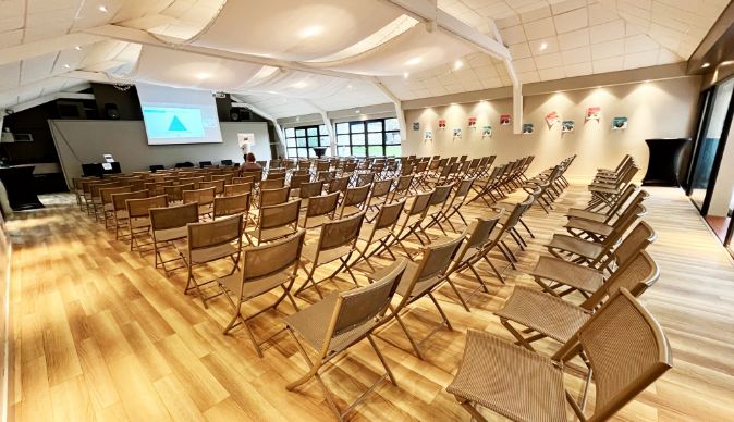 Salle équipée d’un projecteur, d’enceintes et de micros, espace traiteur, toilettes et vestiaires.