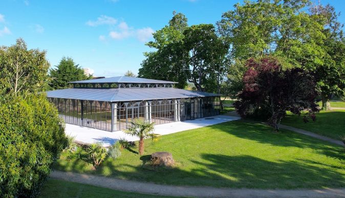 Entièrement vitrée, posée sur un plancher clair, l’orangerie du Château de Beaussais est un lieu à part. Baignée de lumière, ouverte sur le parc et l’horizon marin, elle brouille les frontières entre dedans et dehors. Même en convention, on se sent dans le jardin.